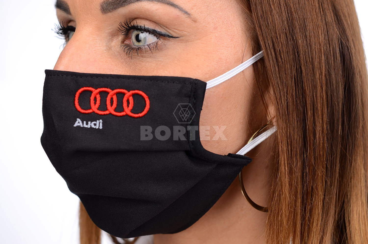 Antibakteriálne bavlnené rúško BORT, dvojvrstvové-1vrstva(100%bavlna), 1vrstva (100%polyester s iónmi striebra)s výšivkou motív AUDI (čierne)