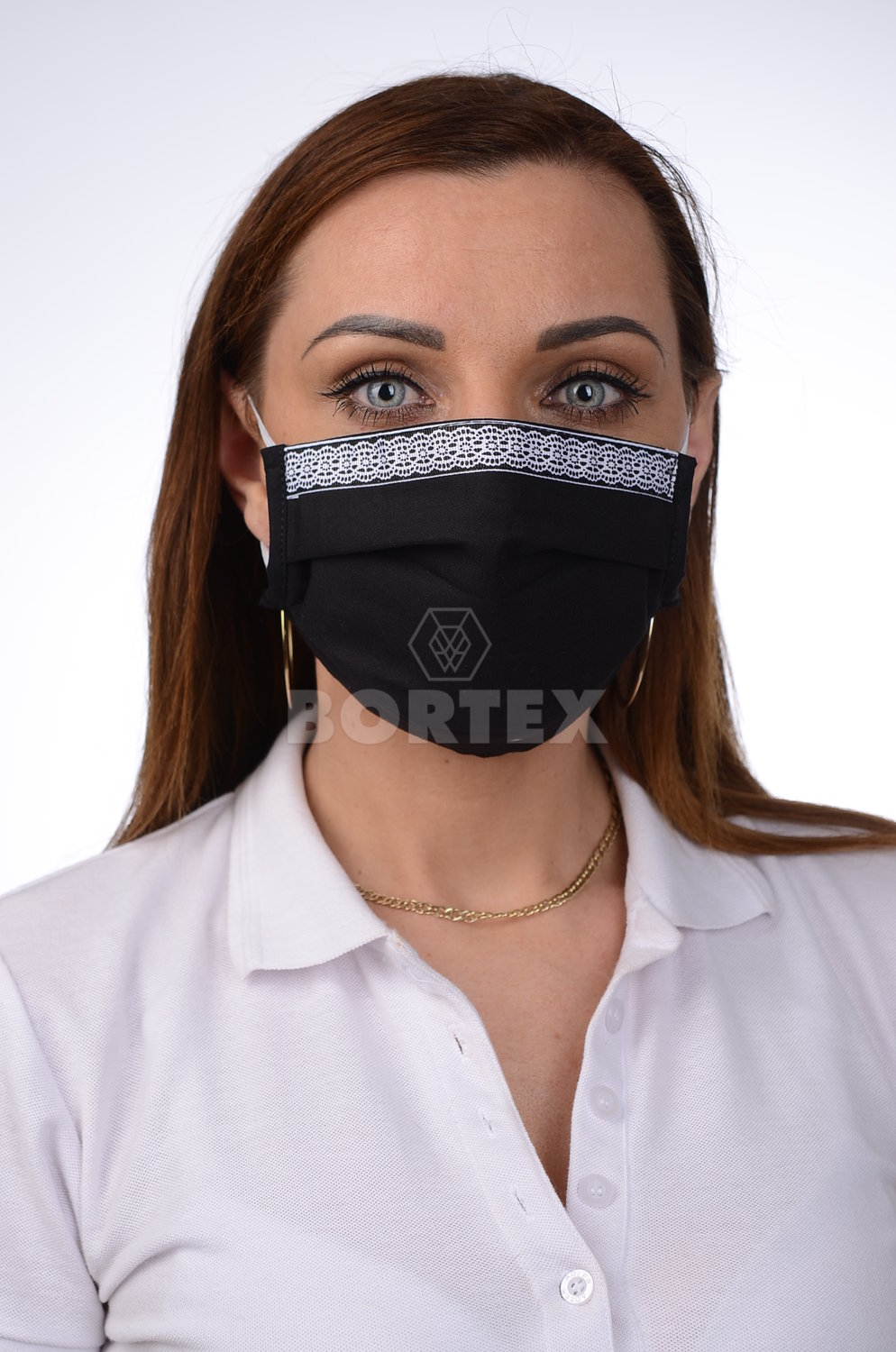 Antibakteriálne ozdobné bavlnené rúško BORT, dvojvrstvové-1vrstva(100%bavlna), 1vrstva (100%polyester s iónmi striebra) motív čipka (čierne)