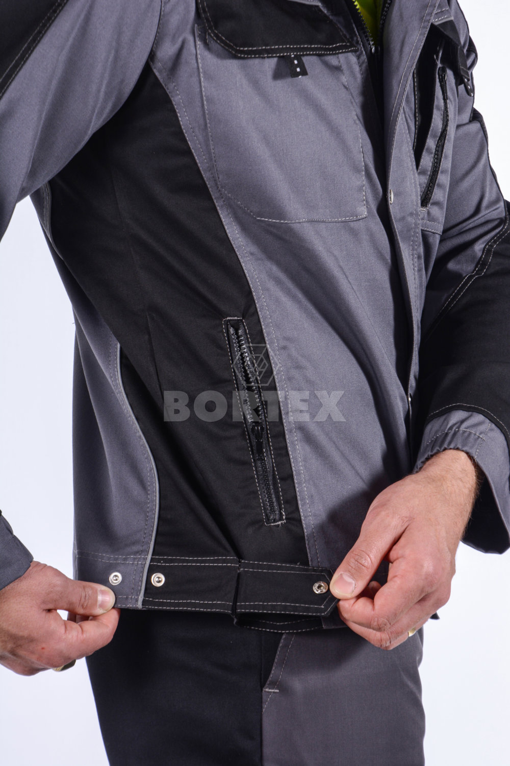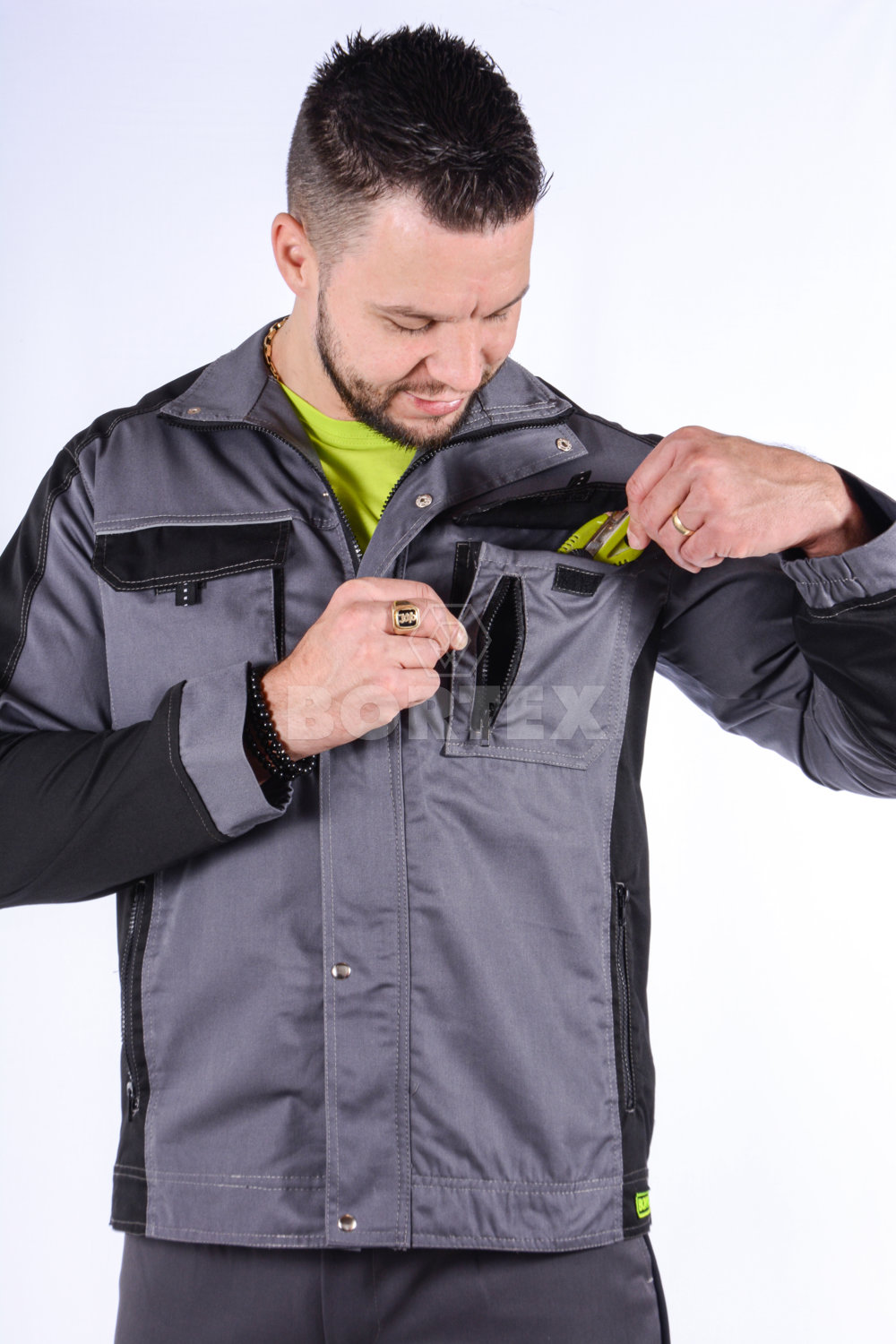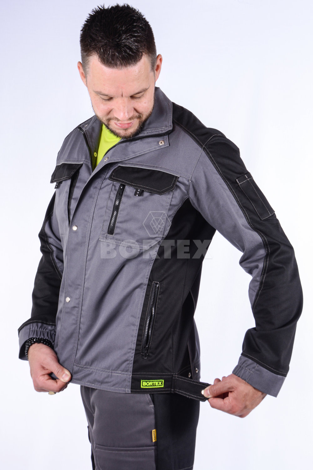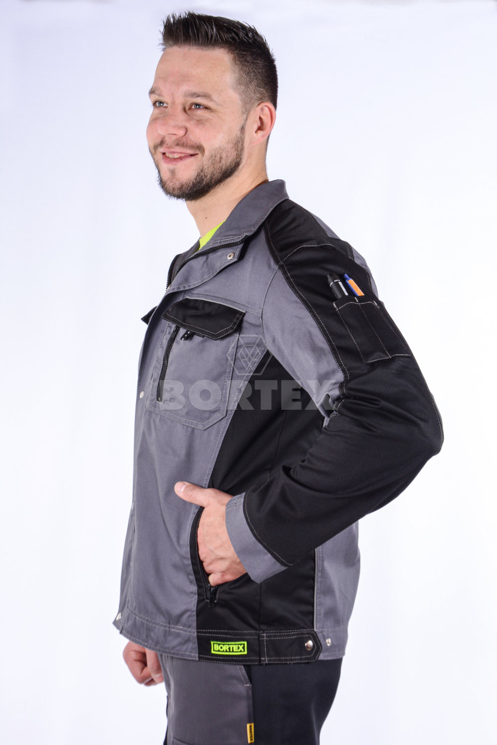 Pracovná blúza je voľnejšie strihu so zapínaním na zips s príklopkou na auto-gombíky.