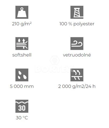 Ľahká softshellová bunda s kapucňou. Kapucňa a dolný lem s možnosťou stiahnutia elastickou šnúrkou. Zapínanie bundy je na celozapínací reverzný špirálový zips. Bunda je odolná proti vetru a dažďu, je priedušná. Spodný lem rukávov nastaviteľný suchým zipsom. Bunda obsahuje kontrastné a reflexné prvky. Tvarovaný mierne predĺžený zadný diel.