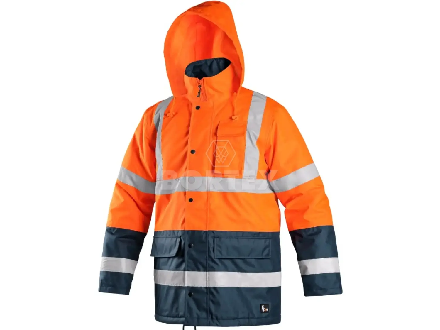 Zimná reflexná bunda s vysokou viditeľnosťou a zateplením. Odolná voči vode a vetru, kapucňa v golieri, reflexné pruhy pre vyššiu viditeľnosť, rukávy a spodný diel zakončené tmavomodrým materiálom, vonkajšie vreckou na mobil, možnosť utiahnutia v dolnej časti bundy.
