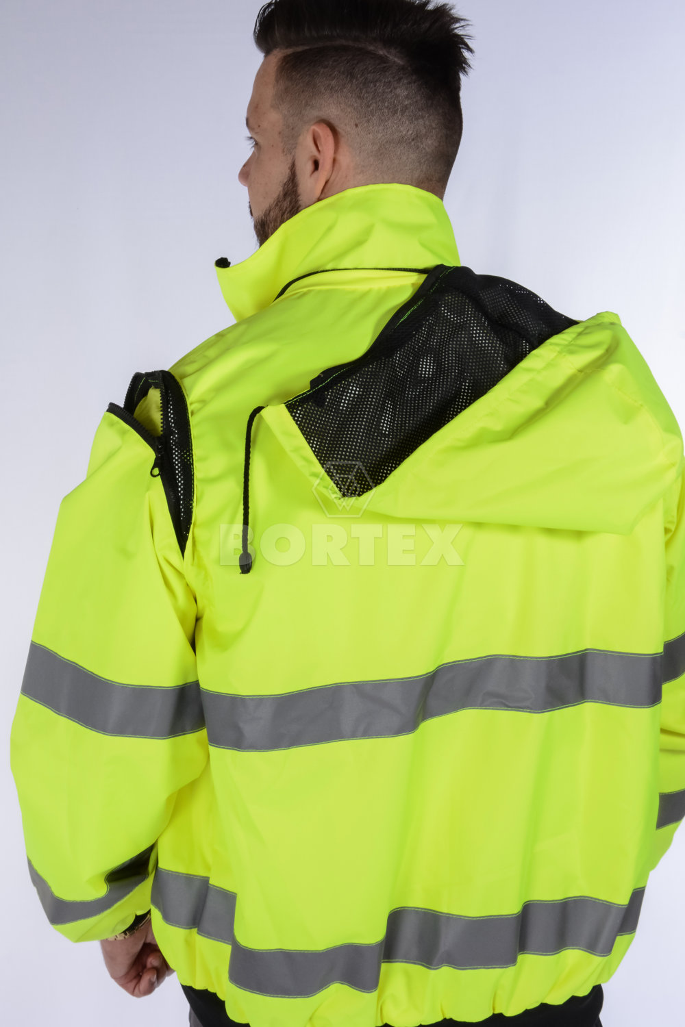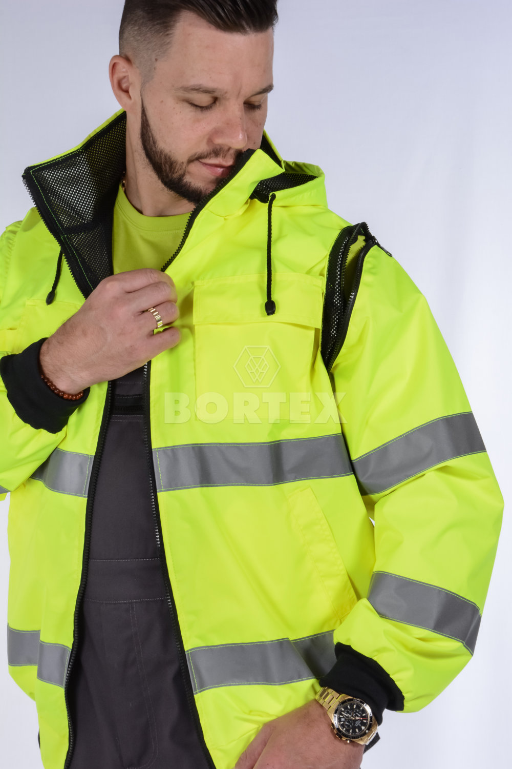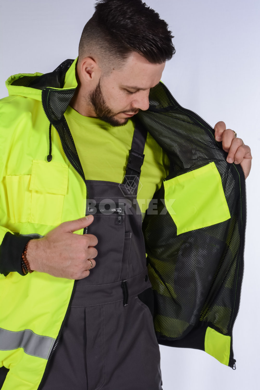 Zapínanie pracovnej bundy je na zips. Spodná časť pracovnej bundy a rukávy sú ukončené úpletom. Pracovná bunda má odopínateľné rukávy na zips. Kapucňa je sťahovateľná šnúrkou a odopínateľná na auto gombíky. Obsahuje dva našité reflexné pásy po celom obvode pracovnej bundy.