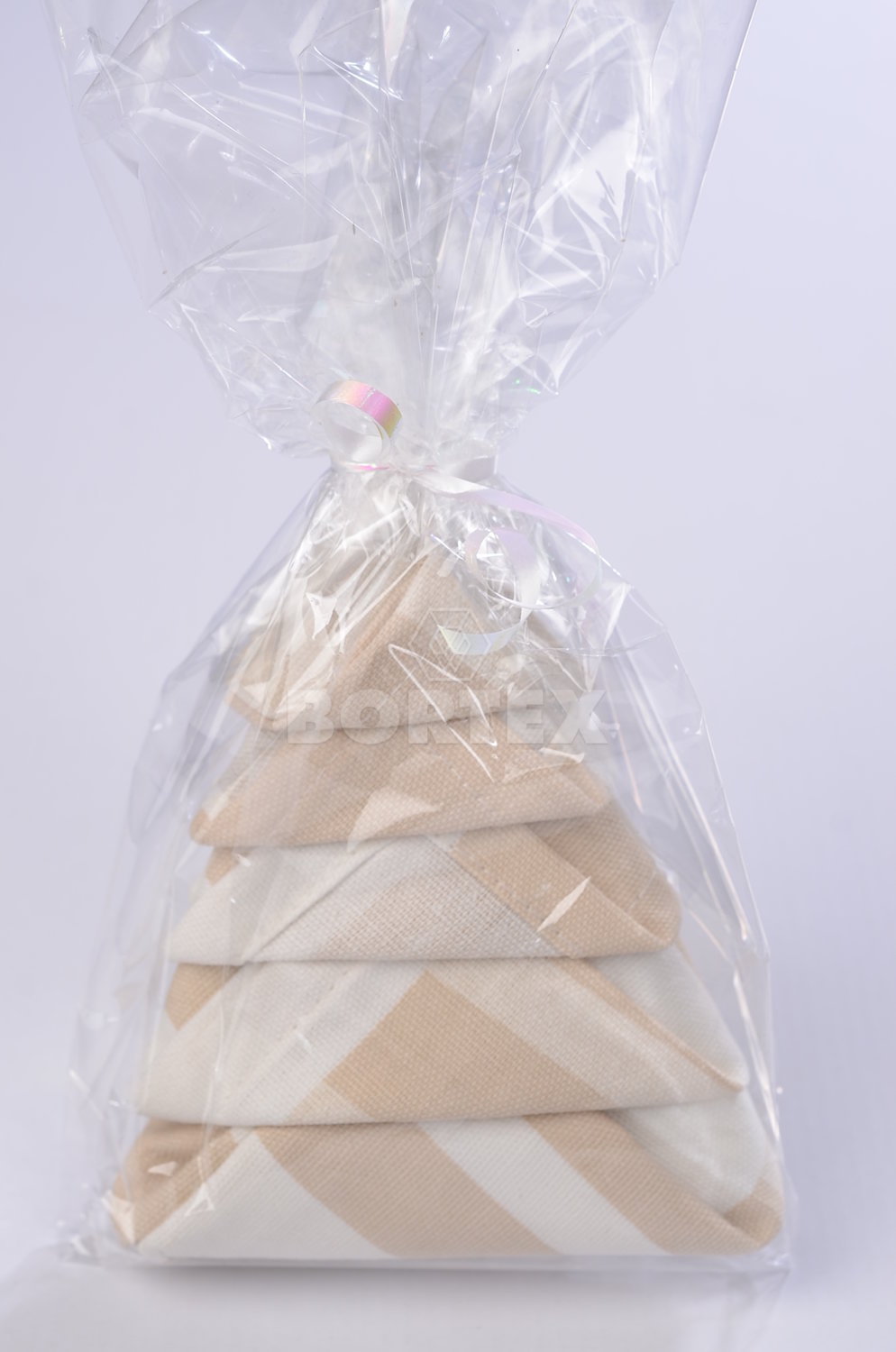 Darčekové balenie utierky, ktorá je poskladaná do tvaru vianočeného stromčeka, zabalená v celofáne, zaviazaná ozdobdou stužkou.