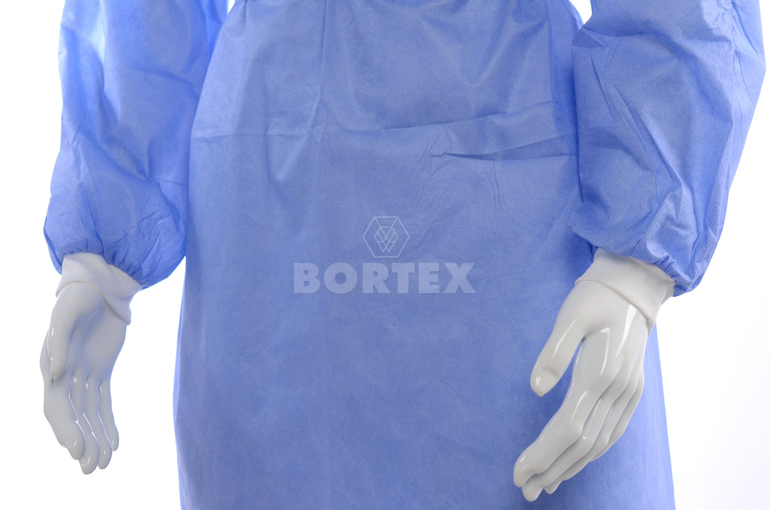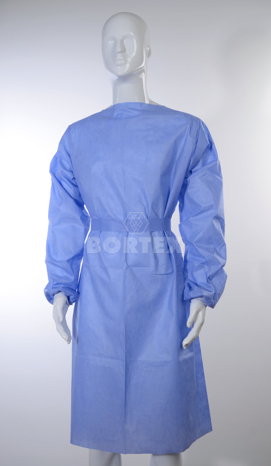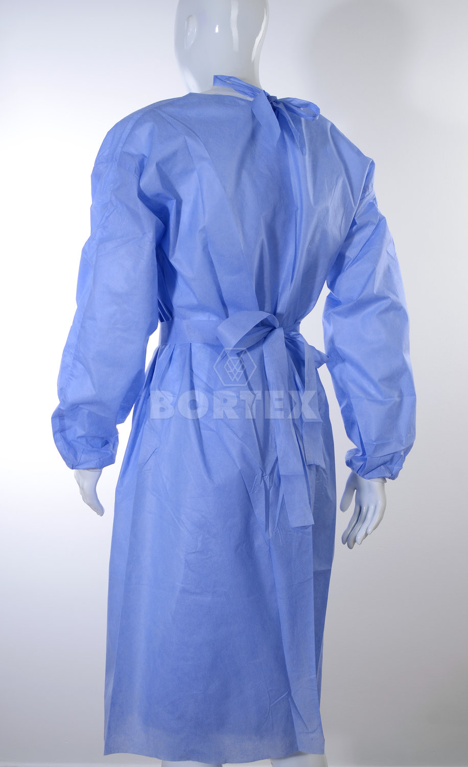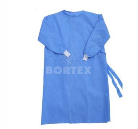 Jednorazový plášť zo 100% netkanej textílie v modrej farbe. Na konci rukávov je elastická manžeta, ktorá chráni pred vniknutím nečistôt.. Zaviazovanie na šnúrku.