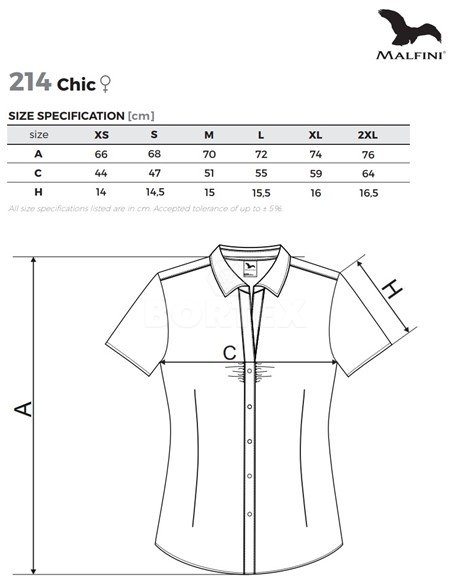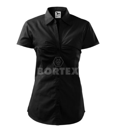 Dámska košeľa s krátkym rukávom z veľmi jemného a príjemného materiálu. Košeľa je tvarovaná pásovými záševkami s jednoduchým sedlom. Pre zvýraznenie dámskej siluety a atraktívnejší vzhľad je oblasť hrudníka vyzdobená riasením. Dvojitý košeľový golier s rozhalenkou, predný okraj začistený légou, tvarovaný dolný okraj. Zapínanie na gombíky, gombíky sú vo farbe materiálu.