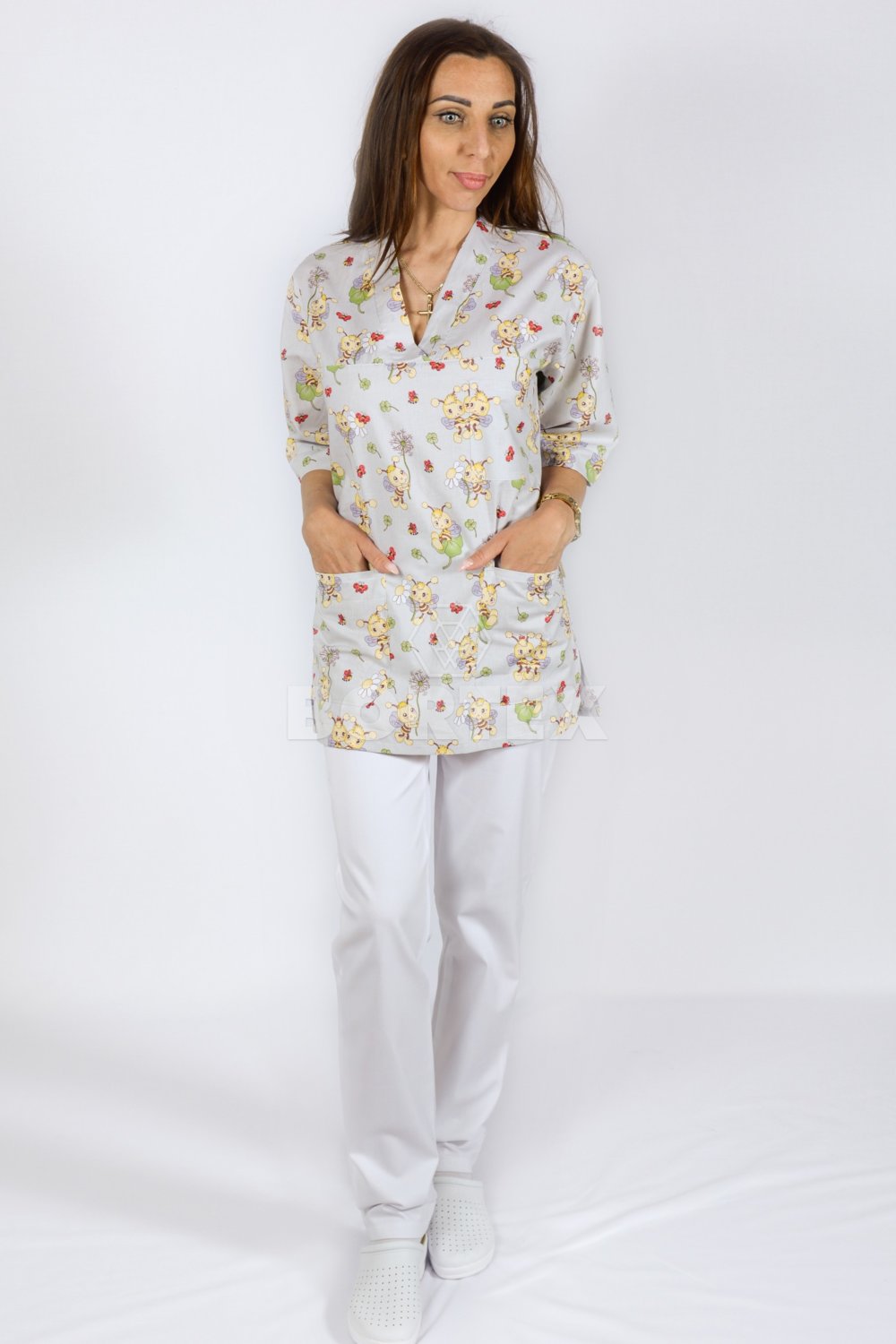 Košeľa dámska zdravotná Eva je konštrukčne navrhnutá ako polopriliehavá, s V-výstrihom a krátkymi rukávmi. Predný diel je v hrudnej časti priečne členený sedlom, v ktorom je spracovaný V-výstrih. Na prednom diele sú odšité prsné odševky a našité tri nakladané vrecká. Jedno náprsné a dve dolné bočné vrecká. Zadný diel je hladký,rukávy sú hlavicové, krátke s manžetami našitými na dolné kraje rukávov. V bočných švoch od dolnej záložky sú spracované krátke rozparky.Konštrukčné riešenie a použitý materiál zaručujú komfortné a pohodlné nosenie.
