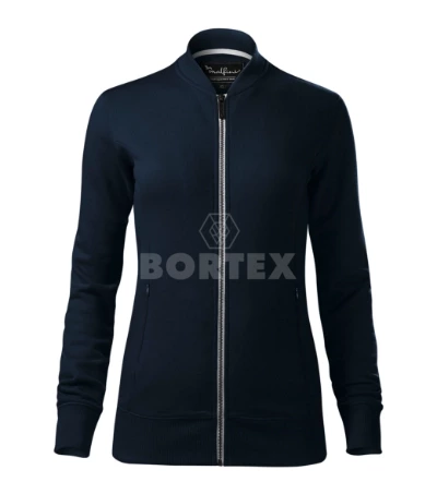 Dámska ležérna mikina v štýle "bomber", zvýrazňujúca dámsku postavu. Celozapínací kovový zips, tiahlo zipsu je s gravírovaným logom. Golier v štýle "bomber" z rebrového úpletu z 5% elastanu. Vnútorná časť priekrčníka je začístená páskou. Na prednom diele sú praktické vrecká v členiacich švoch klokanky. Spodný lem a manžety rukávov sú tiež z rebrového úpletu, z 5% elastanu. Gramáž 320 g/m2.