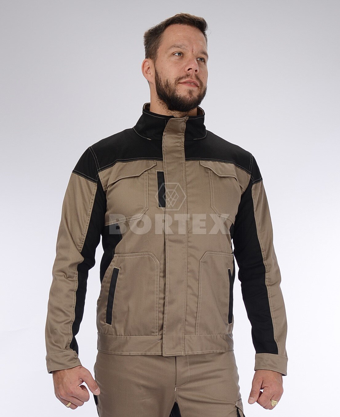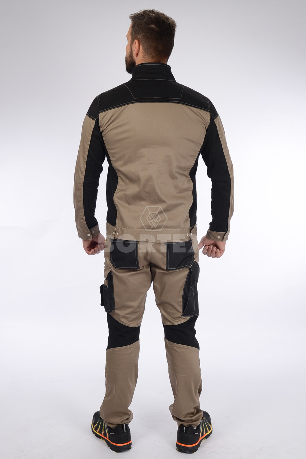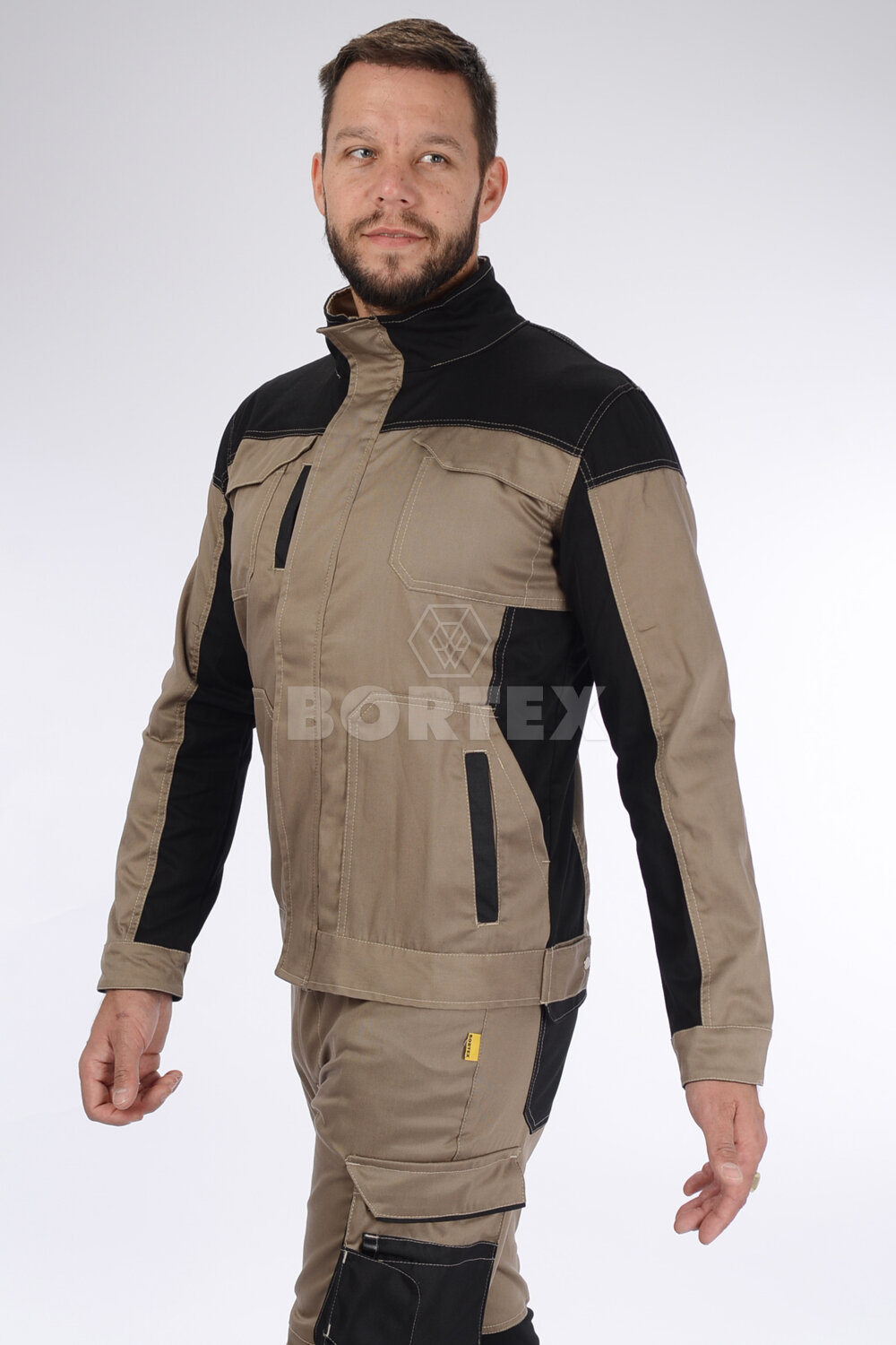 Pracovná bunda je vyrobená zo strečového materiálu, ktorý poskytuje komfort a pohodlie pri práci. Elasticita materiálu umožňuje prispôsobiť sa telu, poskytuje priliehavý strih a zároveň zaisťuje ľahký pohyb - prispôsobuje sa pohybom. Zachováva svoju elasticitu a tvar aj po viacnásobnom použití, vyznačuje sa svojou vysokou odolnosťou voči opotrebovaniu. Strečový materiál je priedušný, zmes materiálov použitých na jeho výrobu zaisťuje, že vzduch môže ľahko prúdiť cez látku a udržuje nositeľa v chlade a suchu. Dobre sa udržiava, vyžaduje minimálnu starostlivosť  a pozornosť.