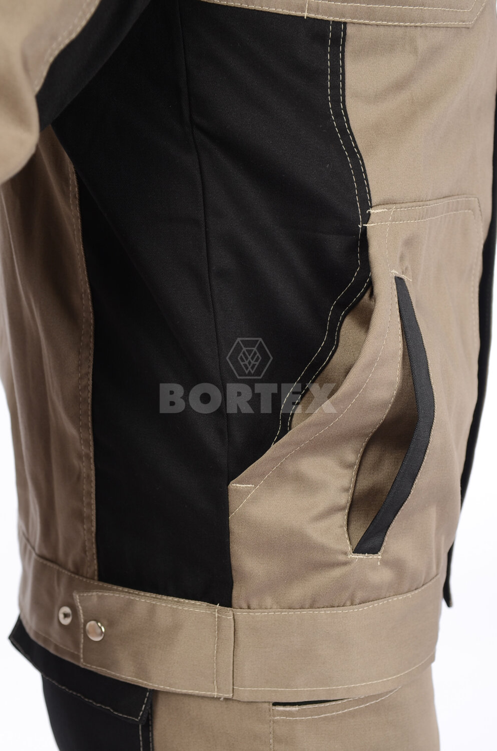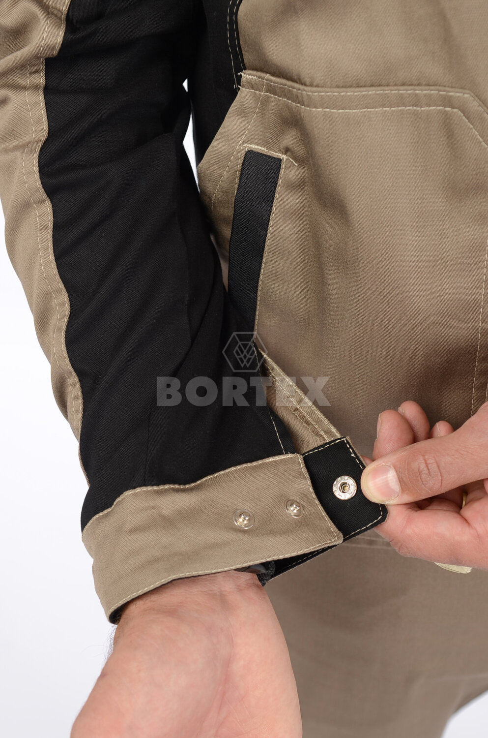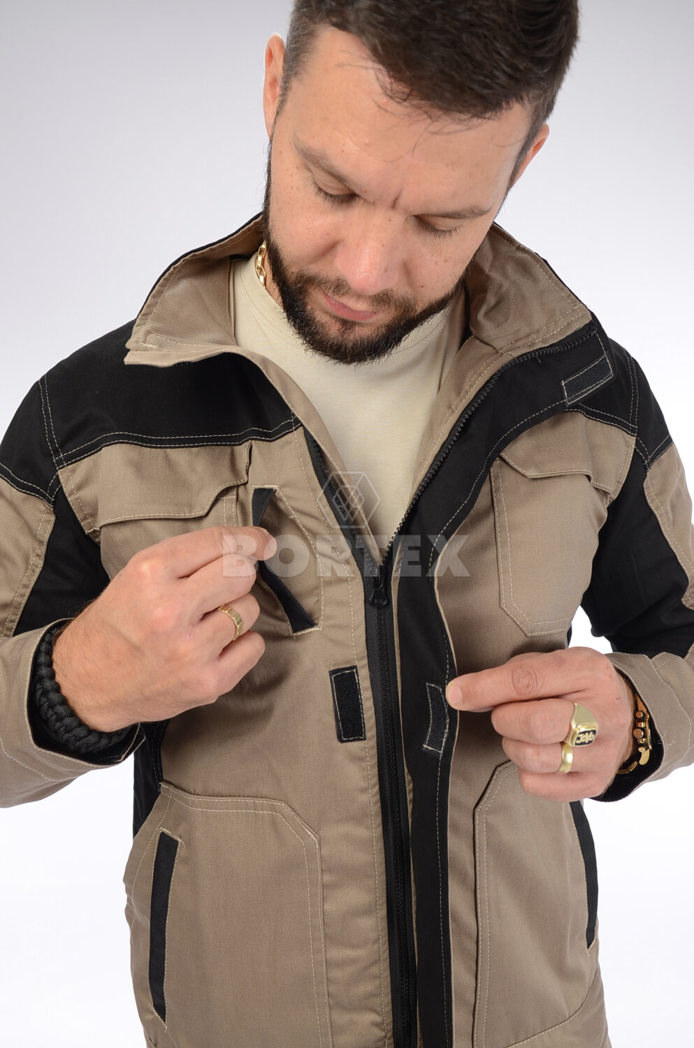 Pracovná bunda je vyrobená zo strečového materiálu, ktorý poskytuje komfort a pohodlie pri práci. Elasticita materiálu umožňuje prispôsobiť sa telu, poskytuje priliehavý strih a zároveň zaisťuje ľahký pohyb - prispôsobuje sa pohybom. Zachováva svoju elasticitu a tvar aj po viacnásobnom použití, vyznačuje sa svojou vysokou odolnosťou voči opotrebovaniu. Strečový materiál je priedušný, zmes materiálov použitých na jeho výrobu zaisťuje, že vzduch môže ľahko prúdiť cez látku a udržuje nositeľa v chlade a suchu. Dobre sa udržiava, vyžaduje minimálnu starostlivosť  a pozornosť.