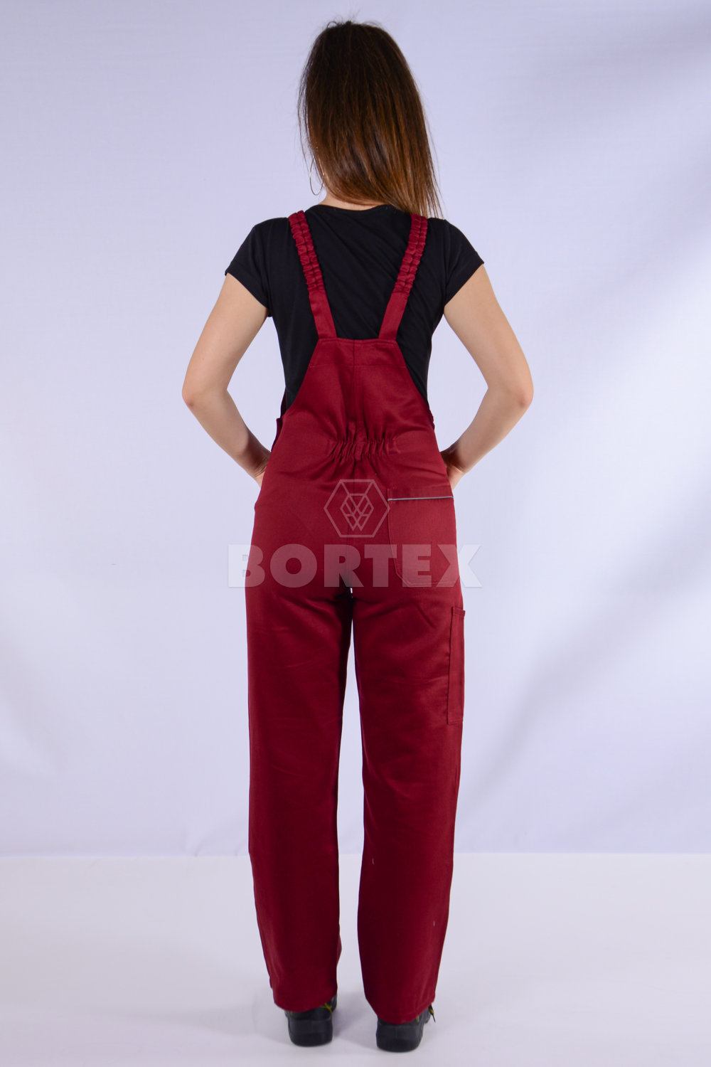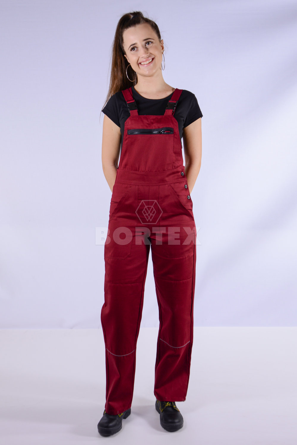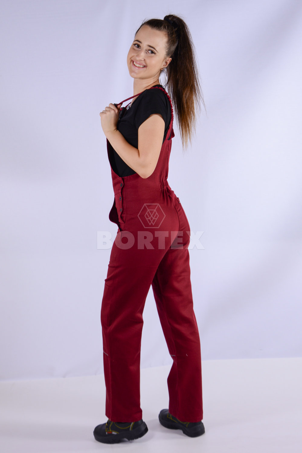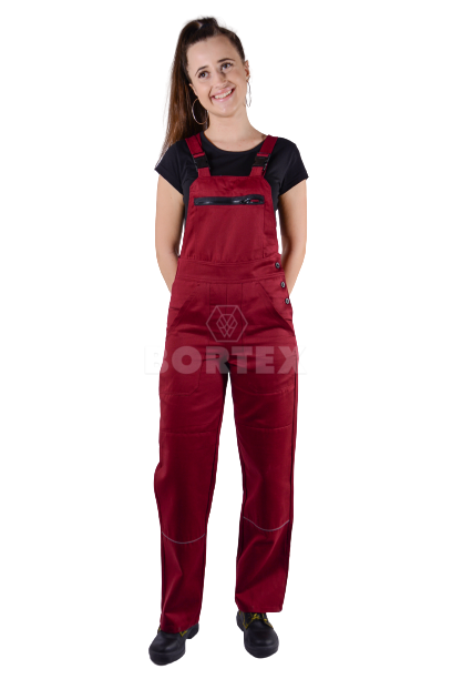 Pracovné nohavice majú trakové zapínanie do umelohmotnej pracky. Zapínanie na boku je na gombíky. Zadný diel pracovných nohavíc je vyvýšený a jemne sťahovaný gumou pre lepšiu priľnavosť k telu.