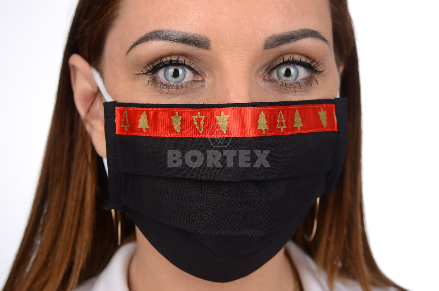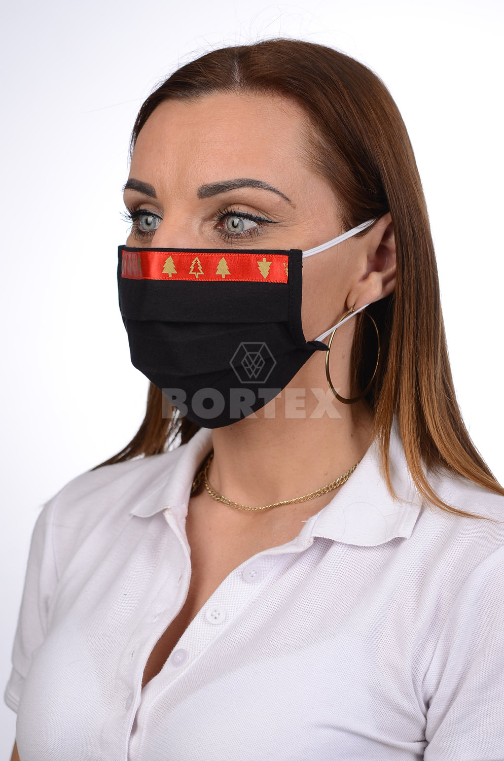 Ochranné rúško antibakteriálne B03-BORT. slovenský výrobok, dvojvrstvové-1.vrstva(100%bavlna), 2.vrstva (100%polyester s iónmi striebra) - ozdobné rúško motív vianočný stromček (čierne) 067
