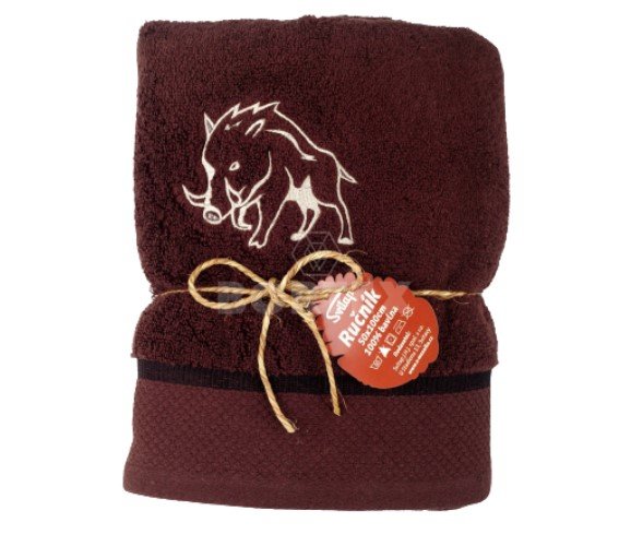 Osuška je ušitá z kvalitnej mikrobavlny SLEEP WELL® v tmavo hnedom prevedení, doplnená výšivkou diviaka.