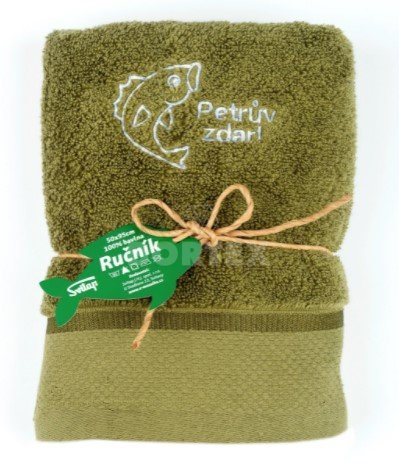 Osuška je ušitá z kvalitnej mikrobavlny SLEEP WELL® v khaki prevedení, doplnená svetlou výšivkou Petrov zdar.