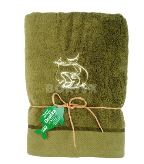 Osuška je ušitá z kvalitnej mikrobavlny SLEEP WELL® v khaki prevedení, doplnená svetlou výšivkou šťuky.