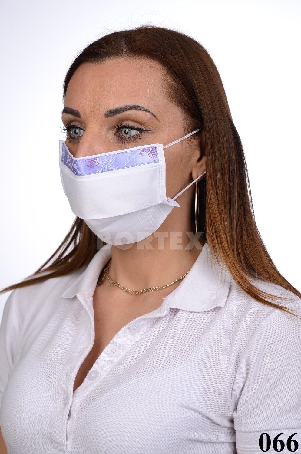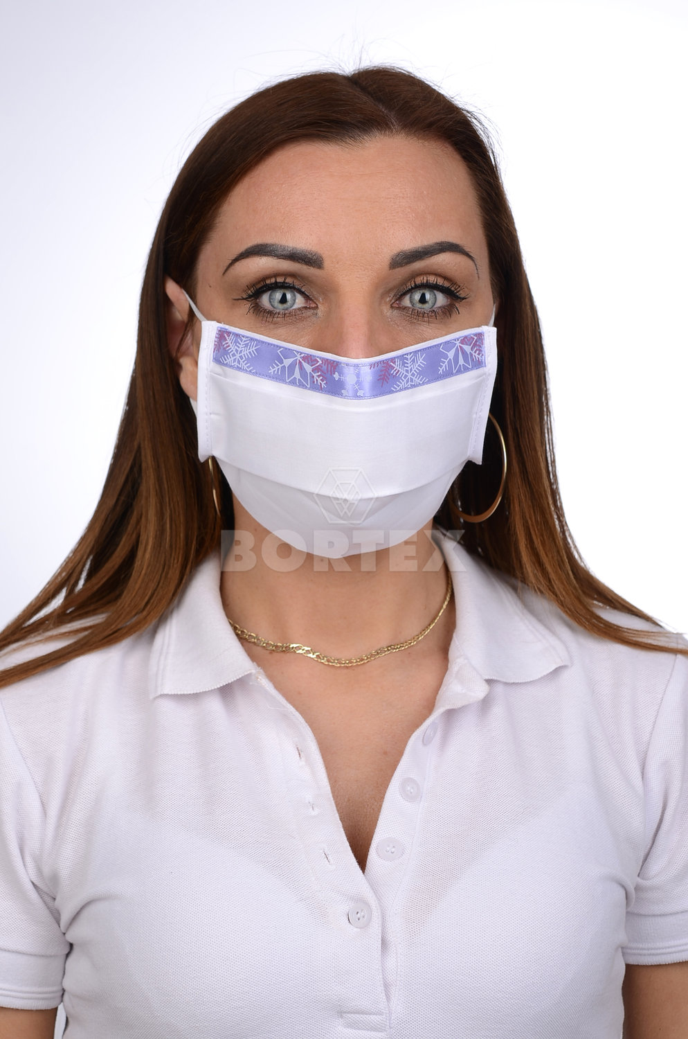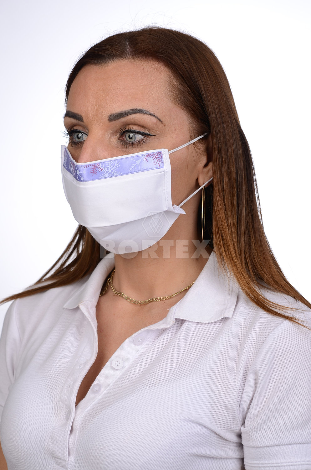 Ozdobné rúško bavlnené na tvár B03-BORT (dvojvrstvové-100% bavlna)-motív snehová vločka (biele)