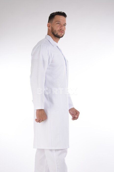 Biely pracovný plášť s dlhým rukávom je vyrobený z kvalitného na dotyk príjemného materiálu - zmesový materiál (65% polyester, 35% bavlna).