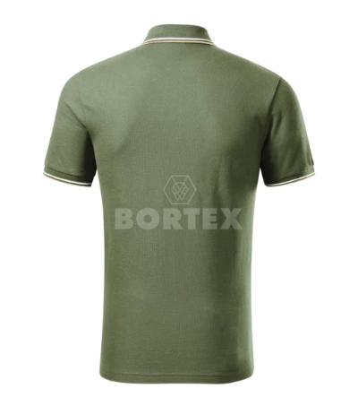Elegantná pánska polokošeľa má klasický strih s bočnými švami a úzkou légou s 3 gombíkmi vo farbe materiálu. Posledný gombík je prišitý kontrastnou niťou. Na rukávoch a golieri sú dva ozdobné kontrastné pruhy z rebrového úpletu.