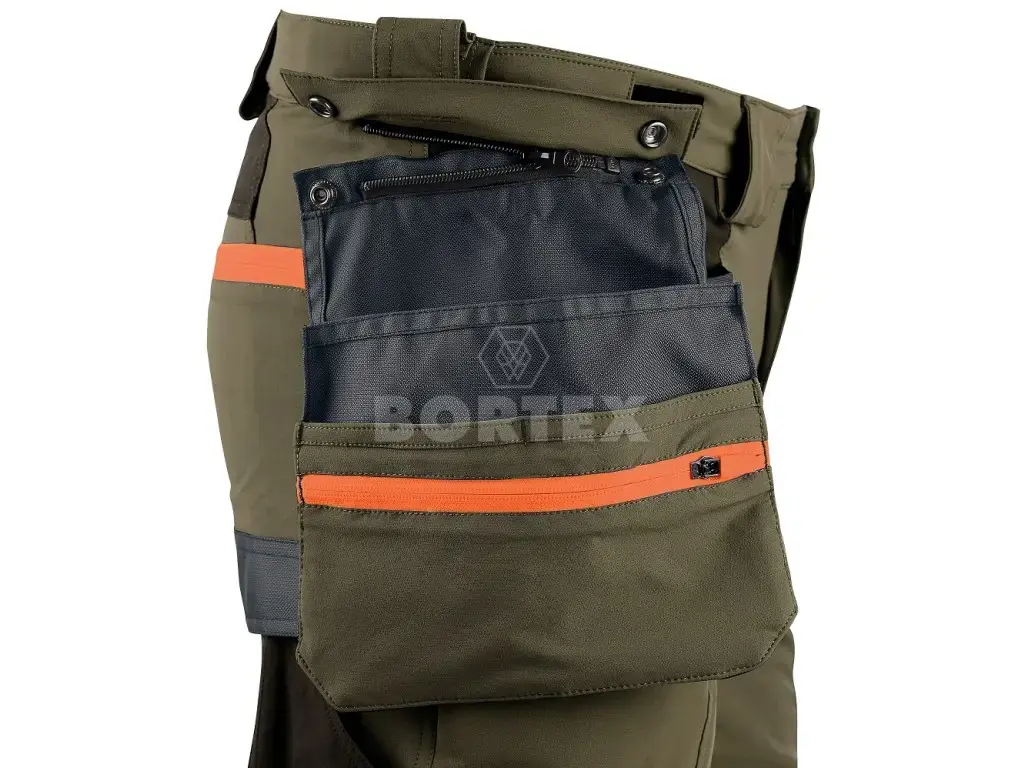 Moderné pánske monterkové nohavice vyrobené z kvalitného a veľmi pružného materiálu 4-way stretch s vysokým obsahom nylónu, ktorý zaručuje rýchle schnutie. Vďaka tomuto inovatívnemu materiálu, ktorý umožňuje roztiahnutie do všetkých štyroch smerov sa budete môcť ľahko a voľne pohybovať pri každej práci. Nohavice majú štýlový užší strih, flexibilný pás s možnosťou úpravy veľkosti a pútkami na opasok, zipsové vetranie na zadnej časti stehien a niekoľko funkčných vreciek - 2 predné, 2 zadné v spodnej časti a 2 odnímateľné vrecká na náradie zosílené materiálom CORDURA, vrecko na zips na stehne, multifunkčné bočné vrecko. Materiálom CORDURA je zosilená aj spodná časť nohavíc a kolená, do ktorých sa dajú naviac vložiť kolenné výstuhy. Pre lepšiu viditeľnosť a tým i väčšiu bezpečnosť pri práci sú nohavice vybavené aj reflexnými doplnkami.