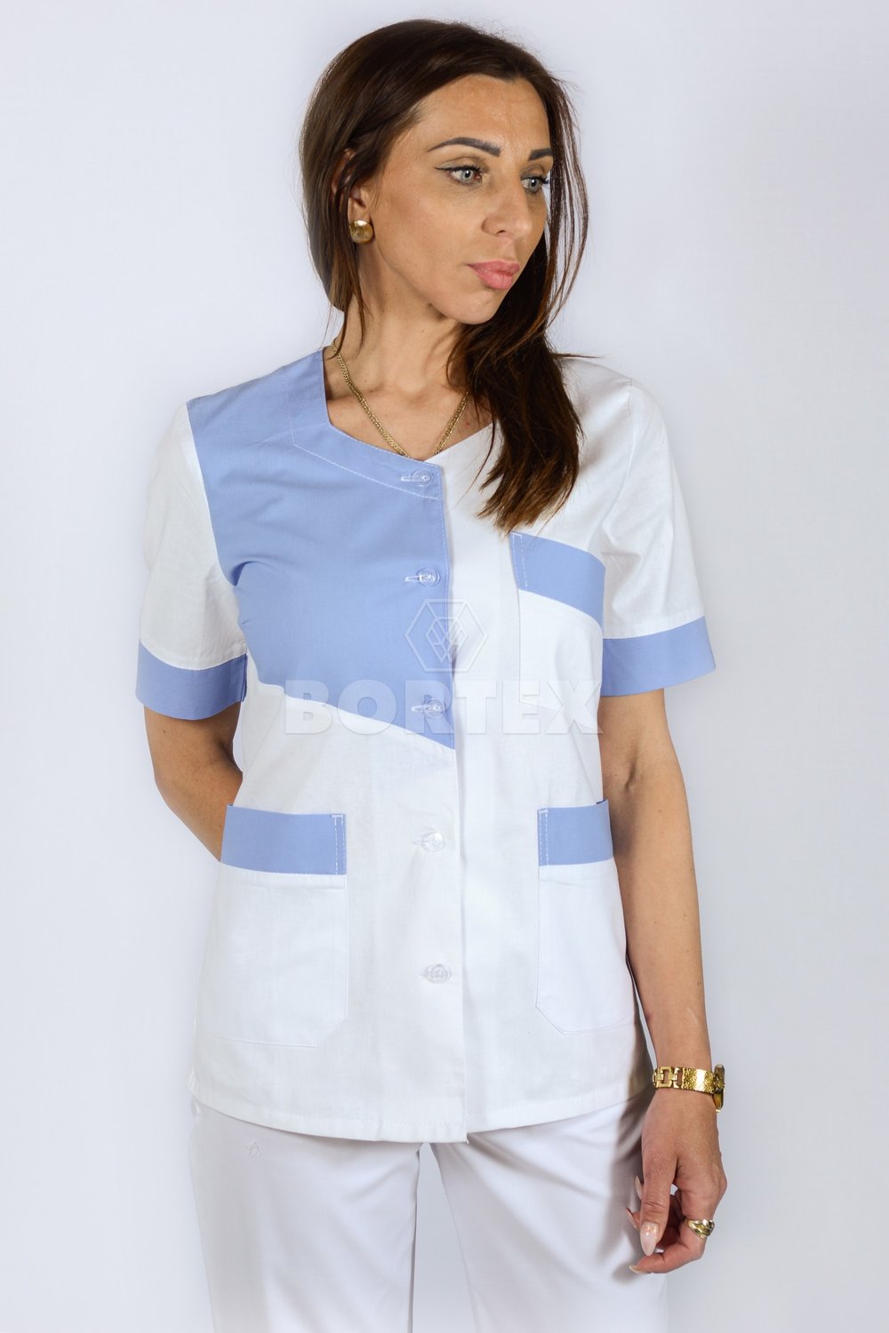 Rozhalenka je rovného strihu s výstrihom. Zapínanie rozhalenky je na gombíky. Súčasťou rozhalenky sú tri vrecká na prednej strane - jedno ľavé náprsné a dve spodné vrecká. Rozhalenka je farebne kombinovaná.