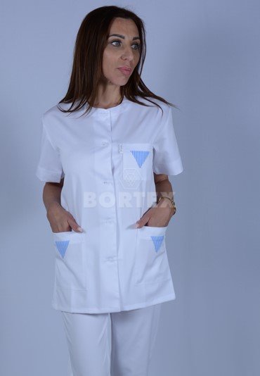 Rozhalenka je rovného strihu s výstrihom. Zapínanie rozhalenky je na gombíky. Súčasťou rozhalenky sú tri vrecká na prednej strane - jedno ľavé náprsné a dve spodné vrecká. Na rozhalenke sú prišité inofarebné trouholníky.