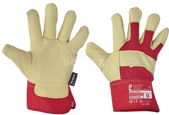 Zateplené kombinované červeno/žlté pracovné rukavice. Vyrobené zo žltej bravčovej lícovej kože v dlani a na koncoch prstov a červenej tkaniny na chrbte a manžete. Zateplenie 3M Thinsulate.
