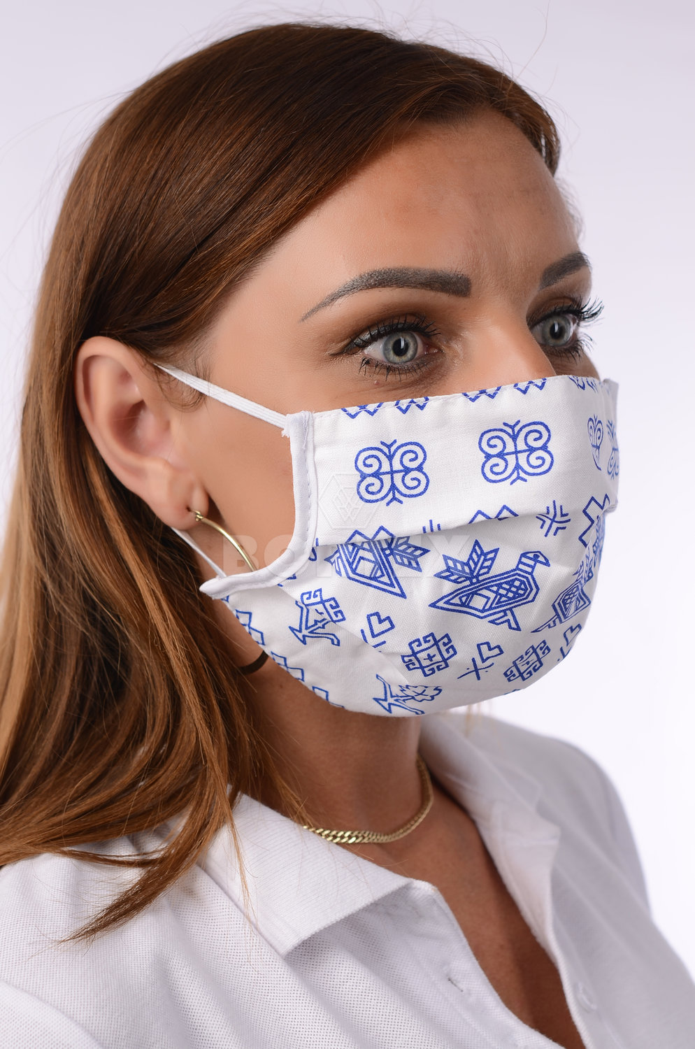 Rúško antibakteriálne ,dvojvrstvové-1vrstva(100%bavlna), 1vrstva (100%polyester s iónmi striebra) s čičmanským vzorom (modré s bielym podkladom)