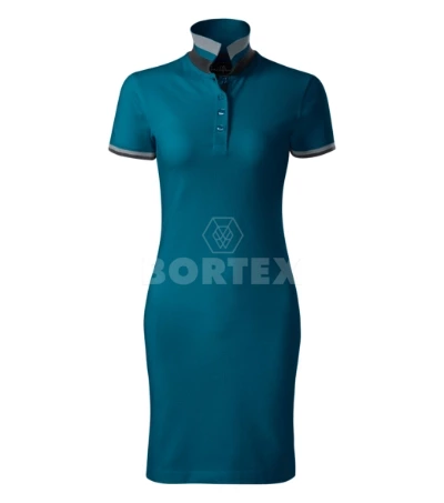 Dámske bavlnené šaty vhodné na každodenné nosenie. Krásny priliehavý strih s bočnými švami. Majú límec a lemy rukávov z rebrového úpletu. Vnútorná časť priekrčníka je začistená kontrastnou páskou. Spodný diel légy je doplnený o kontrastnú tkanú pásku. Rozparky v bočných švoch sú spevnené kontrastnou páskou. Gramáž 215 g/m2.
