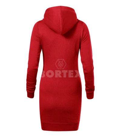 Pohodlné dámske mikinové šaty s dlhými rukávmi sú ušité v mierne priliehavom strihu s bočnými švami, ktoré zvýrazňujú ženskú siluetu. Má dĺžku nad kolená a kapucňu so šnúrkou na stiahnutie. Spodný okraj a manžety rukávov sú vyrobené z pružného rebrového úpletu, takže šaty dobre sedia na tele a pohodlne sa nosia. Má tiež klokanie vrecko. Vnútorná časť výstrihu je ukončená pásikom. Vnútorná strana šiat je nepočesaná.