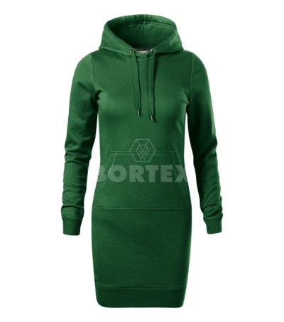 Pohodlné dámske mikinové šaty s dlhými rukávmi sú ušité v mierne priliehavom strihu s bočnými švami, ktoré zvýrazňujú ženskú siluetu. Má dĺžku nad kolená a kapucňu so šnúrkou na stiahnutie. Spodný okraj a manžety rukávov sú vyrobené z pružného rebrového úpletu, takže šaty dobre sedia na tele a pohodlne sa nosia. Má tiež klokanie vrecko. Vnútorná časť výstrihu je ukončená pásikom. Vnútorná strana šiat je nepočesaná.