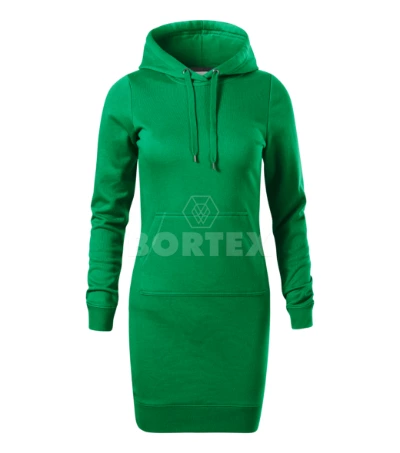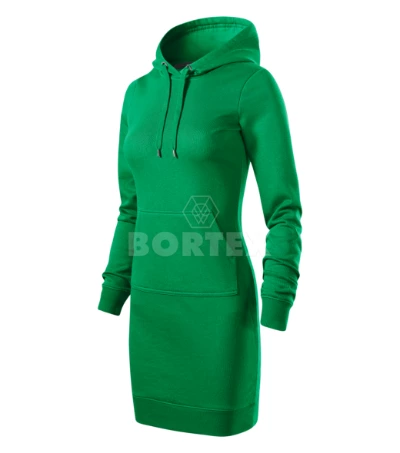 Pohodlné dámske mikinové šaty s dlhými rukávmi sú ušité v mierne priliehavom strihu s bočnými švami, ktoré zvýrazňujú ženskú siluetu. Má dĺžku nad kolená a kapucňu so šnúrkou na stiahnutie. Spodný okraj a manžety rukávov sú vyrobené z pružného rebrového úpletu, takže šaty dobre sedia na tele a pohodlne sa nosia. Má tiež klokanie vrecko. Vnútorná časť výstrihu je ukončená pásikom. Vnútorná strana šiat je nepočesaná.