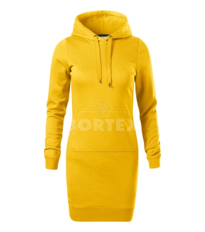 Pohodlné dámske mikinové šaty s dlhými rukávmi sú ušité v mierne priliehavom strihu s bočnými švami, ktoré zvýrazňujú ženskú siluetu. Má dĺžku nad kolená a kapucňu so šnúrkou na stiahnutie. Spodný okraj a manžety rukávov sú vyrobené z pružného rebrového úpletu, takže šaty dobre sedia na tele a pohodlne sa nosia. Má tiež klokanie vrecko. Vnútorná časť výstrihu je ukončená pásikom. Vnútorná strana šiat je nepočesaná.