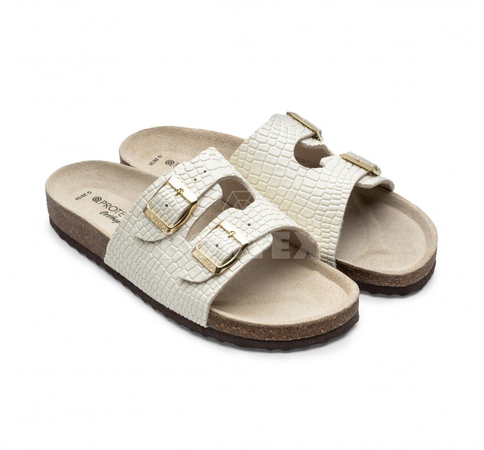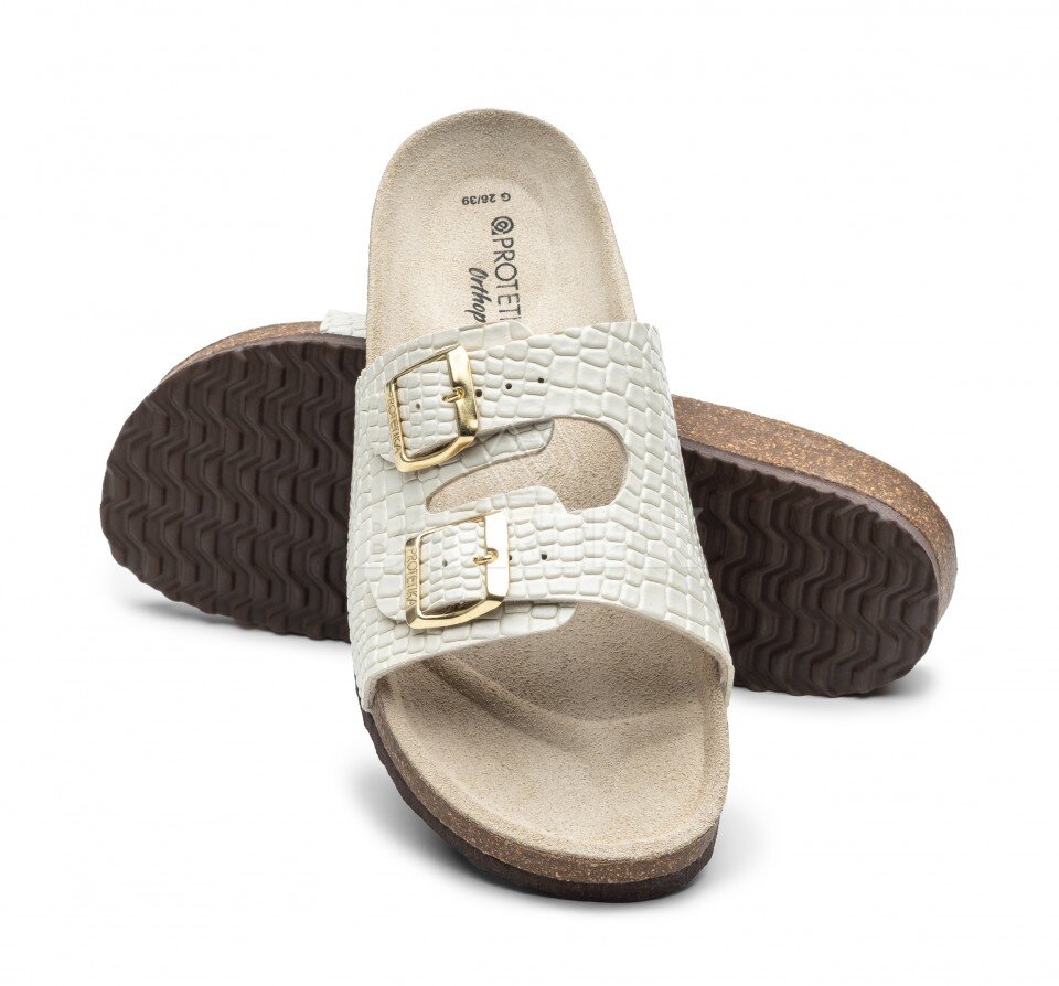 Dámske ortopedicko-rehabilitačné šľapky s anatomicky tvarovanou koženou stielkou podporujúcou pozdĺžnu a priečnu klenbu.