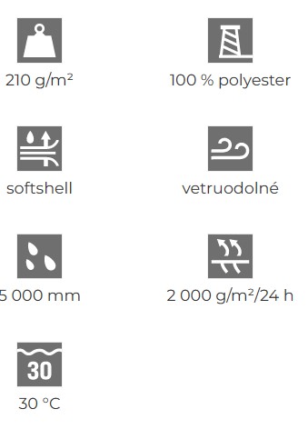 Ľahká softshellová bunda s kapucňou. Kapucňa a dolný lem s možnosťou stiahnutia elastickou šnúrkou. Zapínanie bundy je na celozapínací reverzný špirálový zips. Bunda je odolná proti vetru a dažďu, je priedušná. Spodný lem rukávov nastaviteľný suchým zipsom. Bunda obsahuje kontrastné a reflexné prvky. Tvarovaný mierne predĺžený zadný diel.