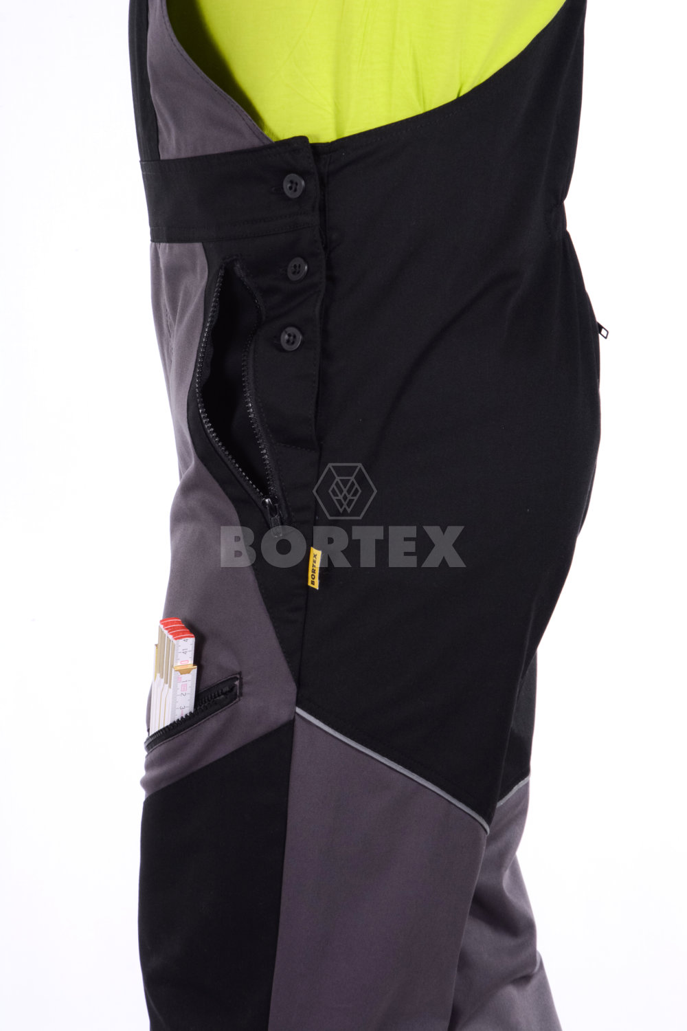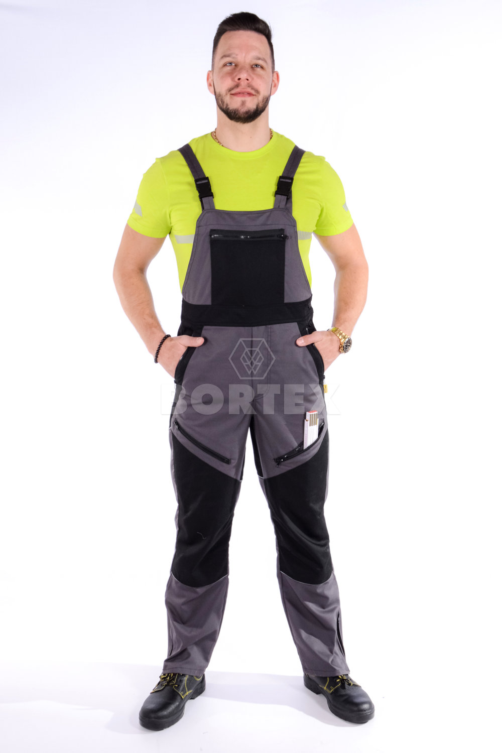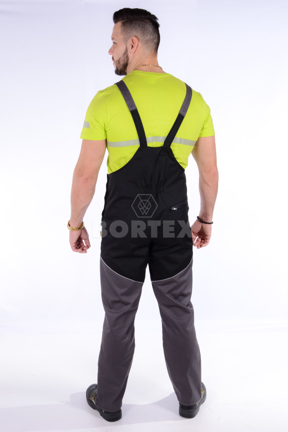 Strihové riešenie pracovných nohavíc zabezpečuje dostatočnú voľnosť pri práci a pohybe. Výhodou je športový vzhľad trakových nohavíc. Sú vyrobené vo farebnej kombinácií s použitím reflexných prvkov pre zvýšenú viditeľnosť a ochranu. Moderný vzhľad, pevný a oderuvzdorný, farebne stály materiál predurčuje tento pracovný odev do pracovného prostredia s vyšším namáhaním. Súčasťou pracovných nohavíc na traky je šesť vreciek na zips. Jedno náprsné vrecko, štyri vrecká z prednej časti a jedno vrecko zo zadu na pravej strane. Výhodou pracovných nohavíc je spevnenie kolien, ktoré je vytvarované prešitím, aby sa nohavice lepšie prispôsobili na telo pri práci v pokľaku. V spodnej časti pracovných nohavíc je otvor na kolenačku a reflexná výpustka pod prešitím. V spodnej vonkajšej časti nohavíc v bočnom šve je všitý zips pre väčšiu voľnosť pri použití objemnejšej ochrannej obuvi. Zadný diel nohavíc je dvojfarebný s reflexnou výpustkou. Rázporok má zapínanie na zips a v ľavom šve je zapínanie na gombíky.