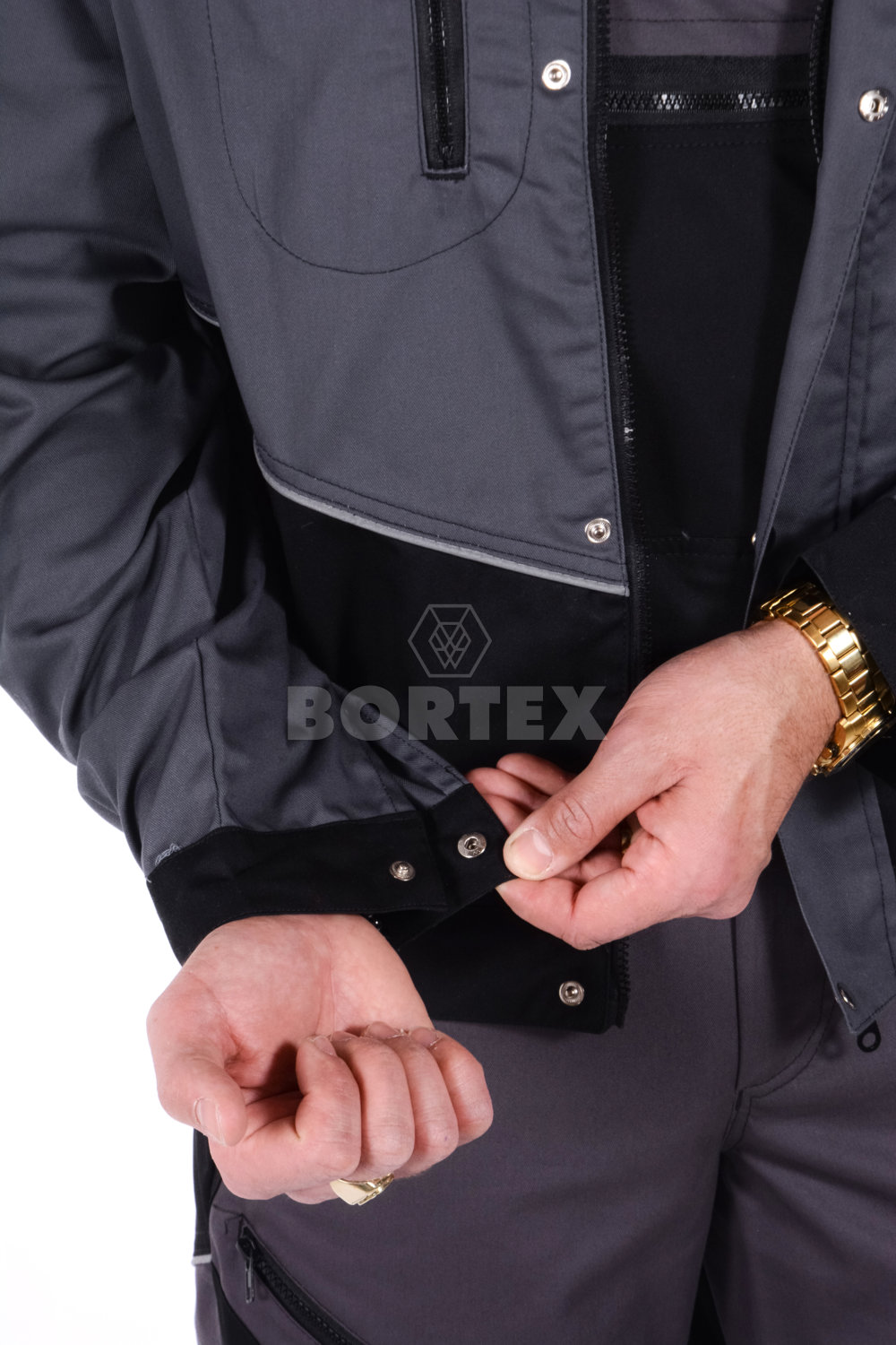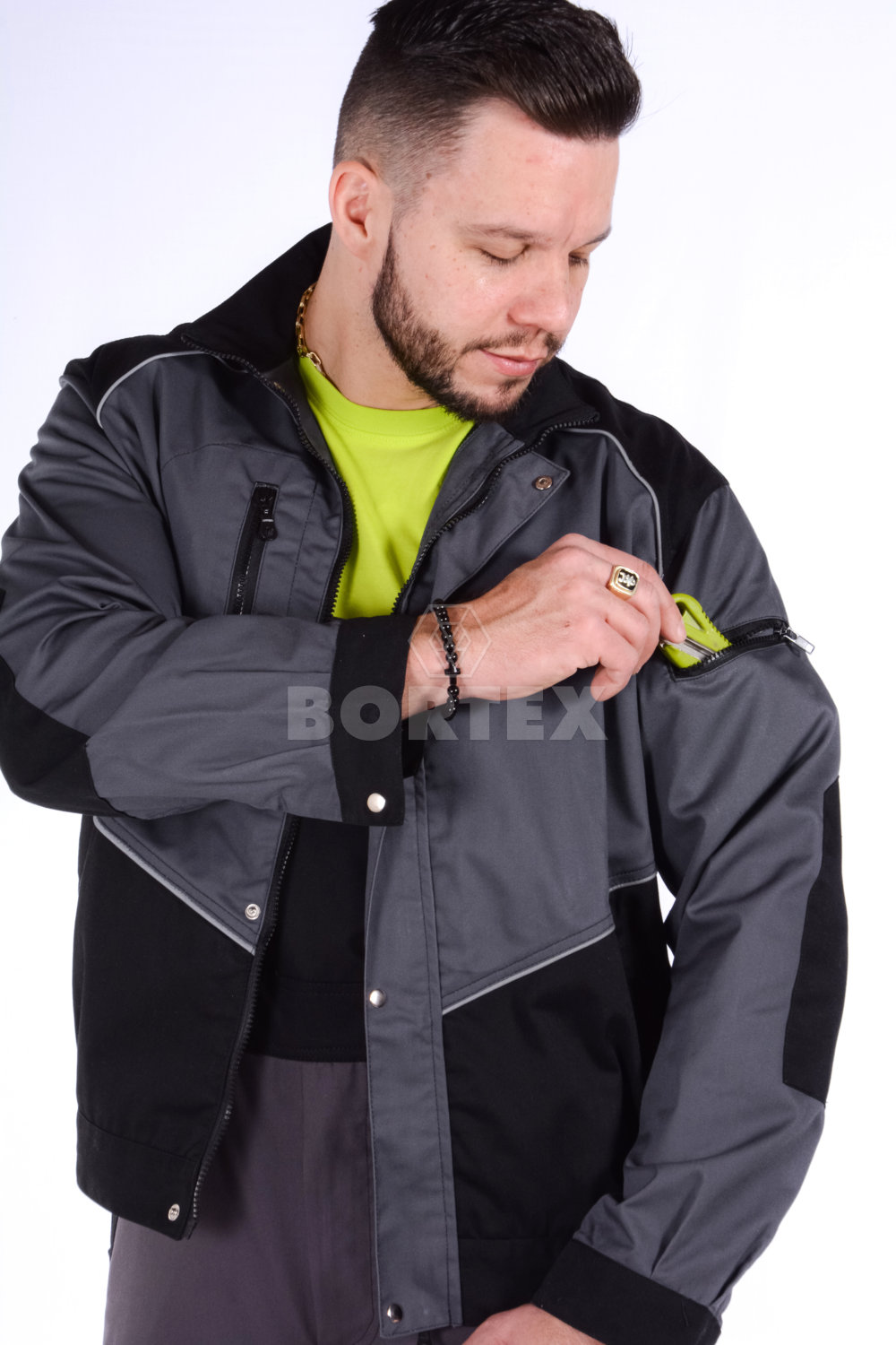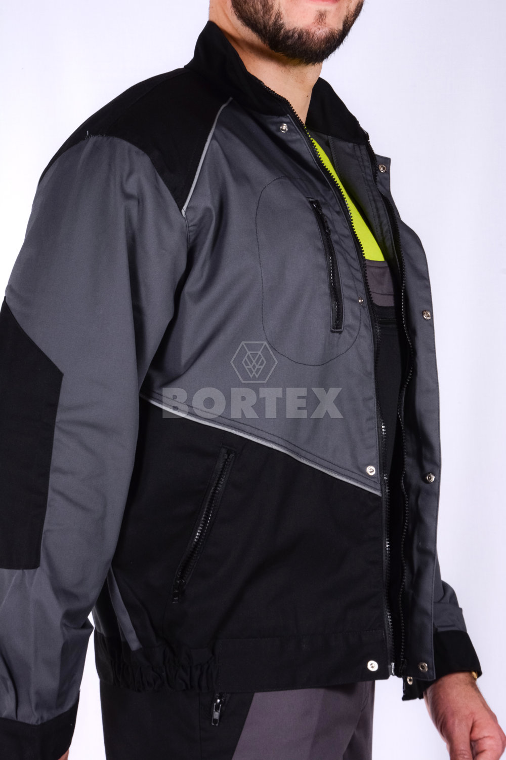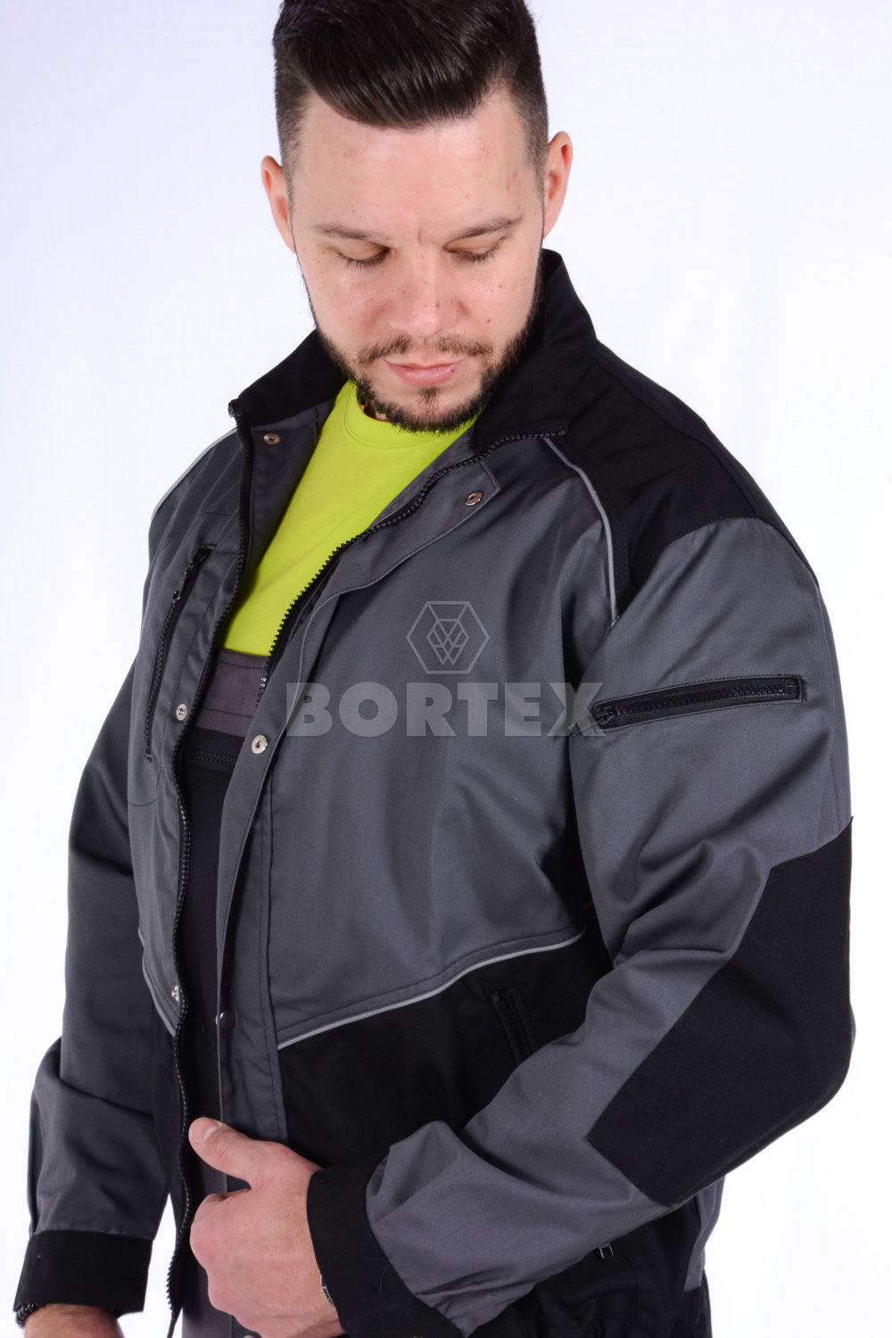 Zateplená pracovná blúza ADAM je voľného a moderného strihu v dvojfarebnej kombinácií so všitými reflexnými lampasmi. Zapínanie je na zips, ktorý končí v stojačiku s príklopkou na auto gombíky. Pracovná blúza ma všité 4 vnútorné vrecká na zips. Jedno vrecko ľavé - náprsné, jedno vrecko na ľavom rukáve v hornej časti a dve spodné vrecká. Rukávy majú zosilené časti v oblasti lakťov. Konce rukávov sú ukončené manžetou so zapínaním na gombík. Spodná časť pracovnej blúzy je stiahnutá všitou gumou z obidvoch strán.