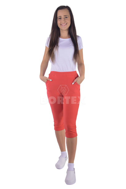 Tepláky 3/4 do pása, rovného strihu, poskytujú pohodlie aj komfort. Zároveň sú pevné pri akomkoľvek odere. Tepláky sú s prinechaným páscom, predšitím so všitou gumou. Na prednej aj zadnej časti teplákov sú dve vrecká.